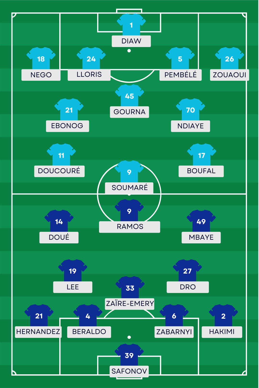 La compo probable du PSG : Safonov – Hakimi, Zabarnyi, Beraldo, L. Hernandez – Dro Fernandez, Zaïre-Emery, Lee – Mbaye, Ramos, D. Doué.
