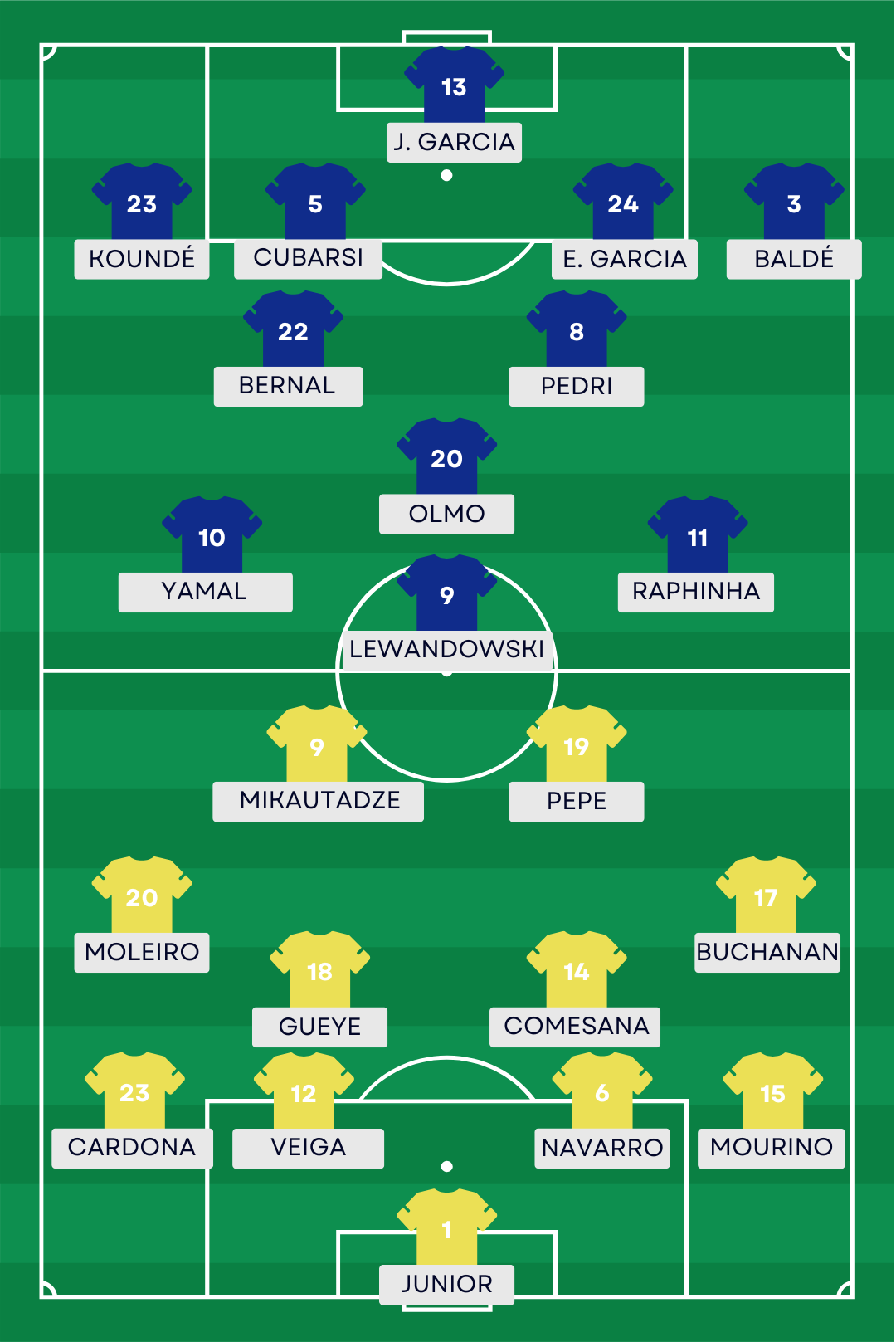 La compo probable du FC Barcelone : J. Garcia – Koundé, Cubarsi, E. Garcia, Baldé – Bernal, Pedri – Yamal, Olmo, Raphinha – Lewandowski.