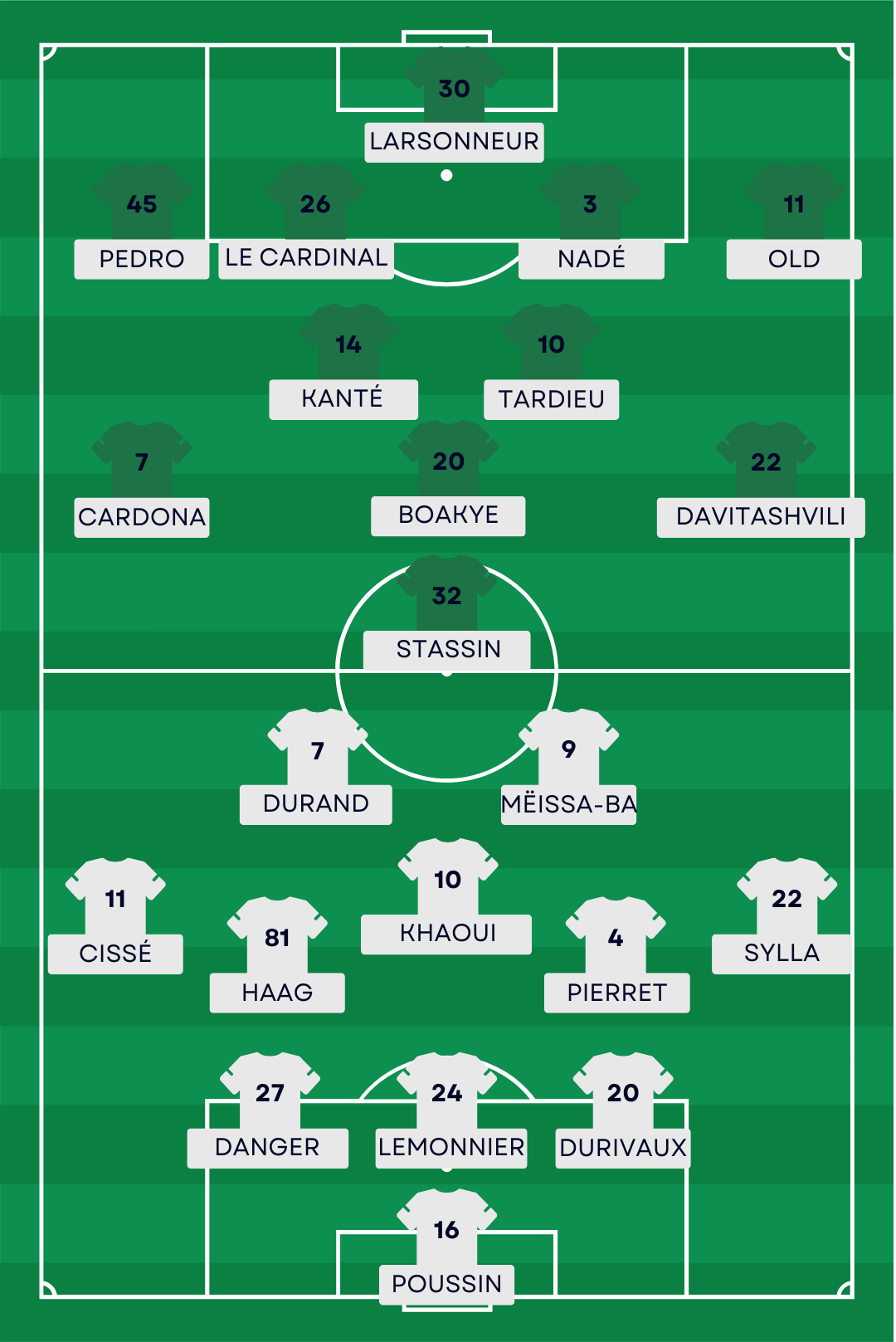 La compo probable de l’ASSE : Larsonneur – Pedro, Le Cardinal, Nadé, Old – Kanté, Tardieu – Cardona, Boakye, Davitashvili – Stassin.
