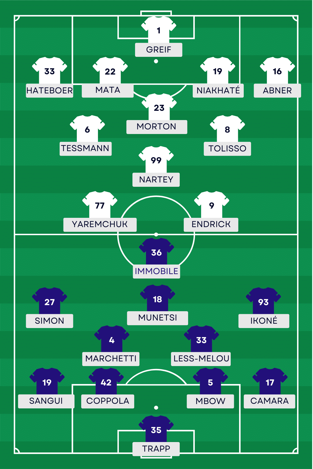 Absents : Nuamah, Fofana, Sulc, Moreira, Kluivert (blessés).