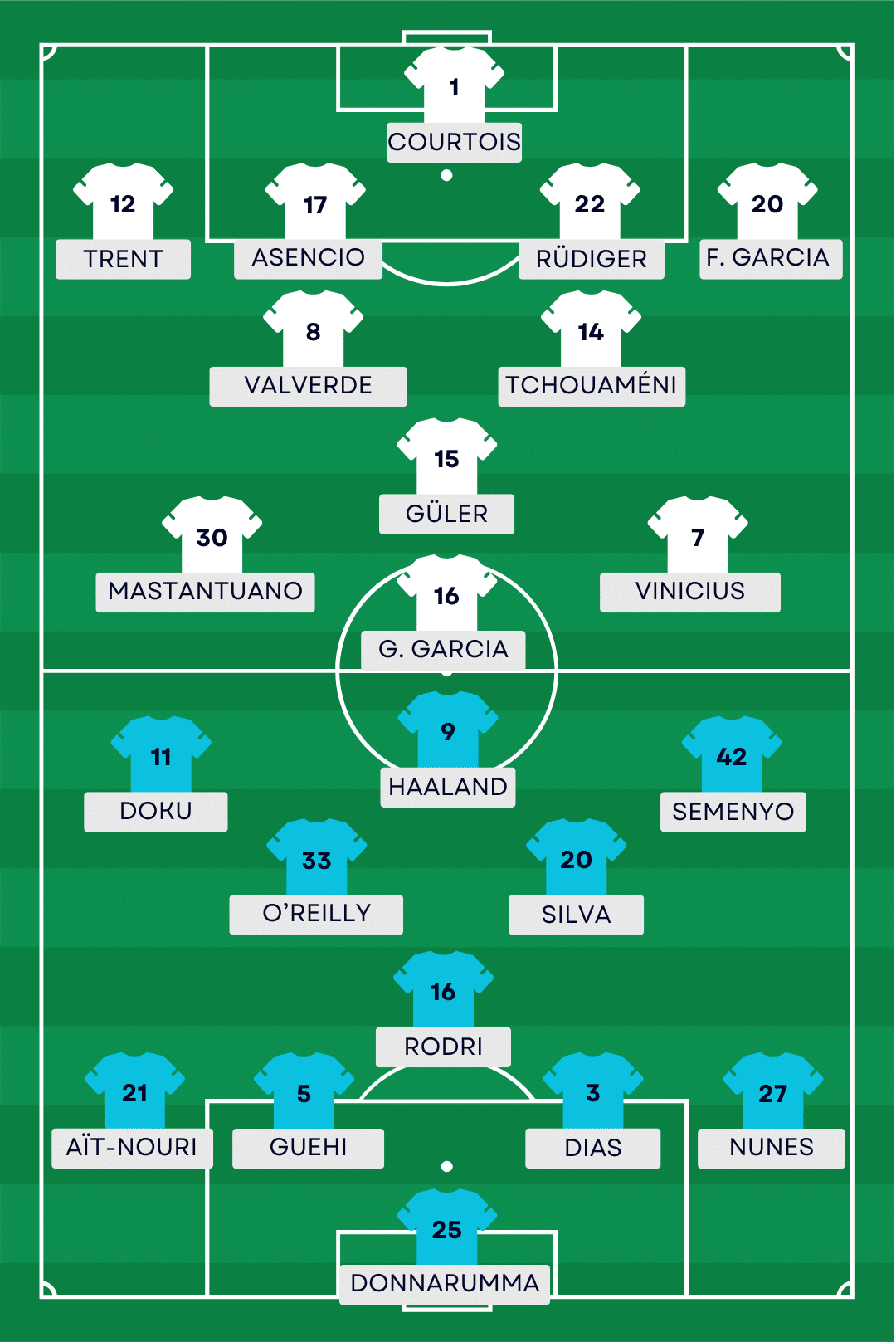 La compo probable du Real Madrid : Courtois – Alexander-Arnold, Asencio, Rüdiger, Garcia – Valverde, Tchouameni – Mastantuono, Güler, Vinicius – Garcia.