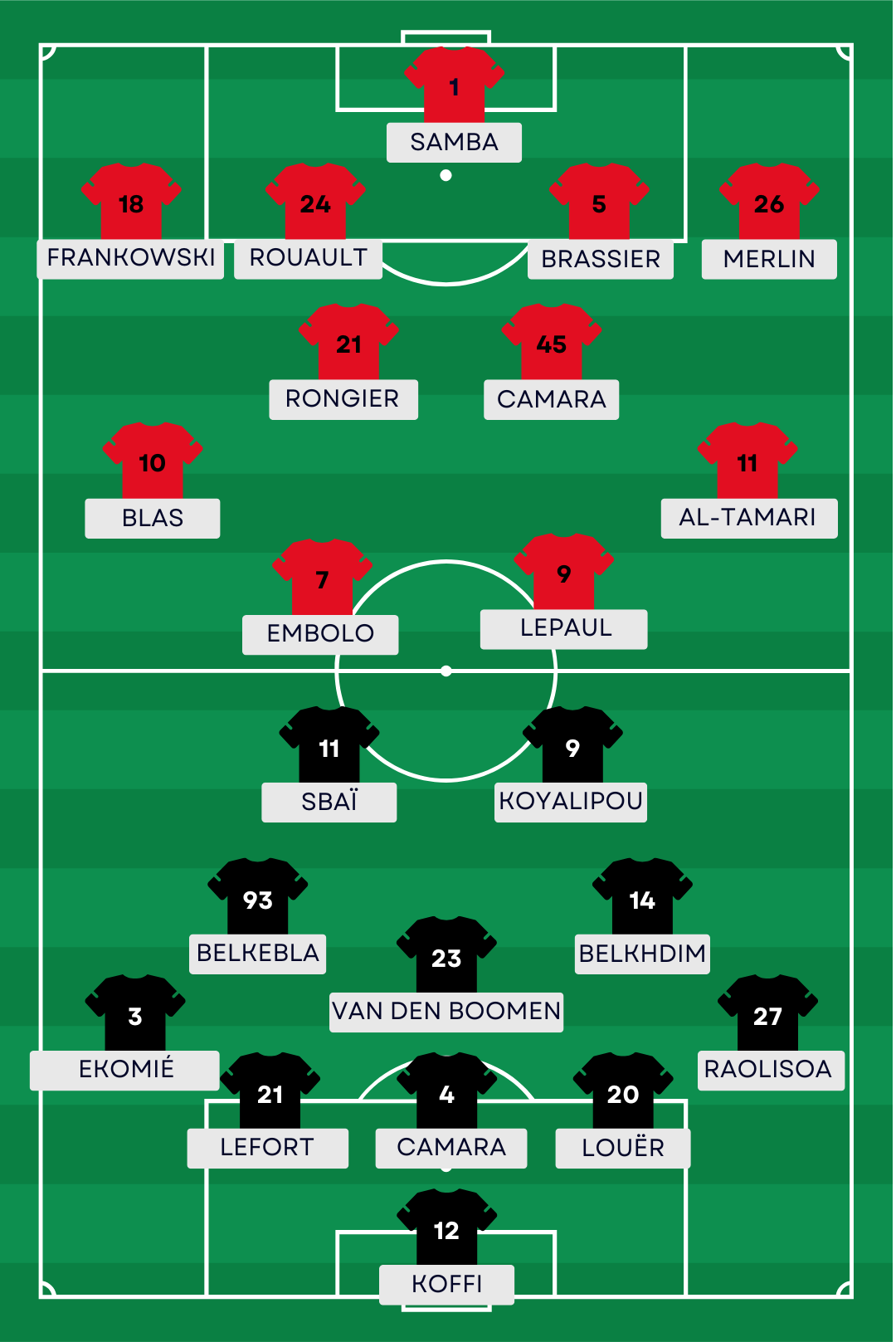 La compo probable du Stade Rennais : Samba – Frankowski, Rouault, Brassier, Merlin – Blas, Camara, Rongier, Al-Tamari – Embolo, Lepaul.