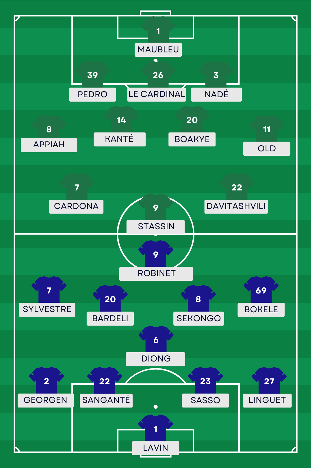 Absents : Bernauer, El Jamali, Jaber, Traoré, Tardieu (blessés).