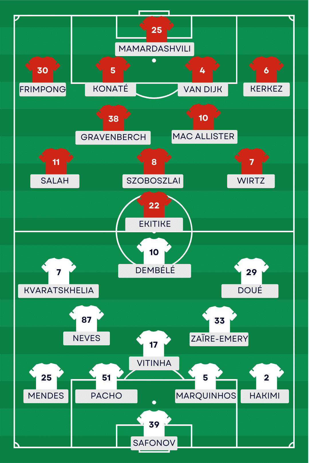 Mohamed Salah (Liverpool) : Attendu de retour dans le onze des Reds après être resté sur le banc tout au long du match aller, l’Égyptien sera attendu pour porter son équipe dans les moments clés. Sa capacité à faire basculer un match sur une action individuelle sera essentielle pour Liverpool.