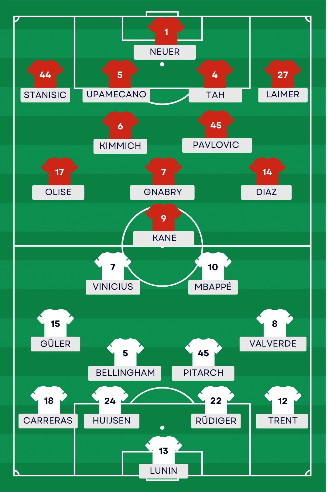 Vinícius Júnior (Real Madrid) : Principal danger offensif côté merengue avec Kylian Mbappé, le Brésilien sera attendu pour porter les phases de transition et déséquilibrer la défense allemande. Sa vitesse, ses prises de balle tranchantes et sa capacité à provoquer en un contre un pourraient être déterminantes dans la tentative de remontée du Real Madrid.