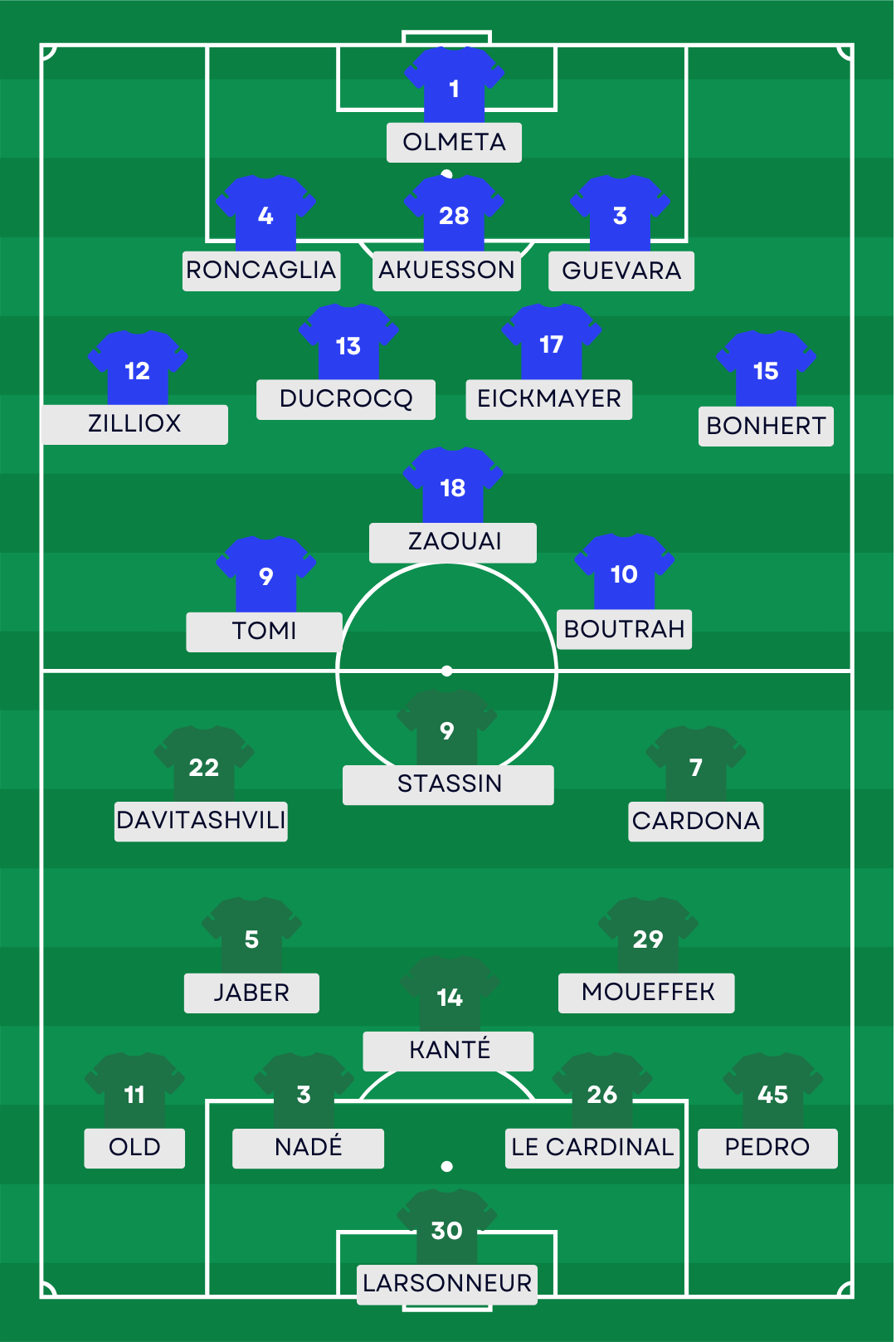 Absents : Ariss, Bathily, Djedje, Merghem, Meynadier, Parravicini, Roncaglia, Vincent (blessés), Guidi (suspendu).