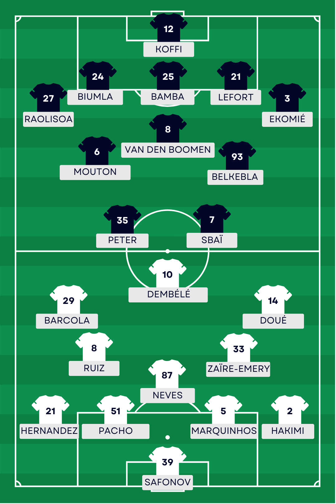 La compo probable du PSG : Safonov – Hakimi, Marquinhos, Pacho, L. Hernandez – Zaïre-Emery, Neves, Ruiz – D. Doué, Dembélé, Barcola.